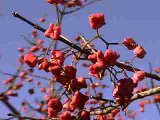 マユミでしょうか 「花」ではないけれど 遠くで見ると「花」に 見えます ちょっと苦しい(++)! でもきれいですね!!!! |