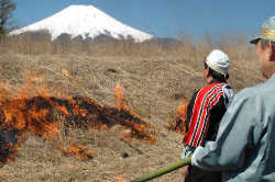 左:火をつける関係者 上中:入会権を主張して集まった組合員 上右:静かに見守る富士山
