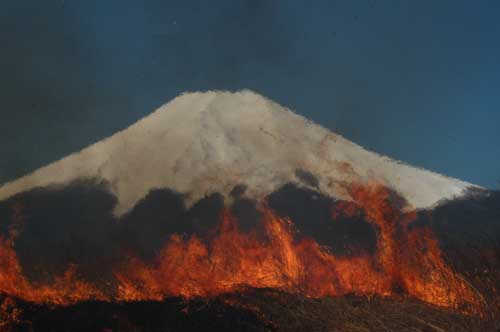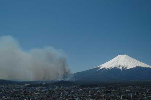 | 2007年4月29日快晴で雲ひとつないはずの富士北麓、山中湖や忍野村に来た観光客は戸惑ったことでしょう。富士山は雲って見えず、車の中には煙が入ってきたのではないでしょうか。 上空から見ると(左上から2枚目)まるで側火山が噴火したように、もくもくと煙が立ち昇っています。ほとんど風がなく、やや西風に乗って煙は風下の山中、忍野方面にたまっています。この上空からの写真は午前10時半頃です。この後煙は富士吉田市に向ってきました。前日28日は春の嵐のように突風と雨でした。富士急ハイランドのフジヤマが向かい風で失速するほどでした。それ程でなくても、もう少し風が欲しいところでした。もっとも、風の中で数年前、火入れに行った人が死亡する事故も起きているので、多少煙いのは我慢するしかないのでしょうか。 火入れは地元の入会権益を主張する行動です。見返りに莫大な補償金が入ってくるのですから、煙いとか汚れるなんてことは目をつむるしかないのでしょう。 当日は山梨県知事はじめ行政のトップから各関係団体の役員、職員総動員の一大行事として取り組まれました。 演習場があるおかげで、こんなに膨大なススキの原野が残っているのだと考えると自衛隊さまさまです。 火入れが終わった30日は何事もなかっかのように快晴が続いて、初夏の陽気になりました。ギボシやワラビなど草花が目を出し、花の原野を演出してくれるのももうすぐです。演習のない日曜日は誰でも入れるススキの原野です。たまに、不発弾も見つかる原野ですが、未舗装の道路を砂埃を上げながら走れるところなんて、今時ここしかないかも知れませんね。 |