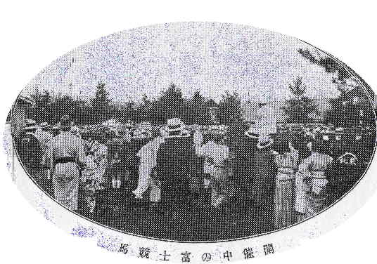 吉田から山中湖に向かう途中の左手、現在ファナックの工場の近くだろうか、昭和初期競馬場があった。大明見から大勢の人が切符切りのアルバイトに出かけ、また、子供をつれて見物に出かけたそうである。「郡内の100年」に看板の写真が掲載されていたが、今回全体の写真と大勢の人で賑わう様子の写真があったので紹介する。 | |||