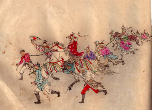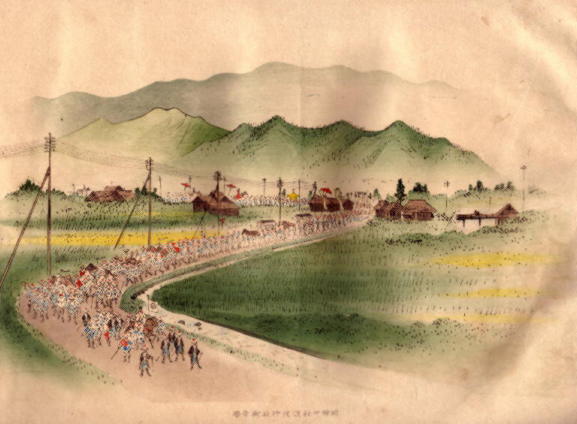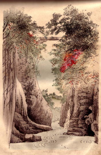| 上は河口湖の一部、右は猿橋を描いたものだ。猿橋は、鉄道開通前の様子を描いたか、意図的に猿橋と平行して走る中央線の鉄橋を消していると思われる。明治35年10月には鳥沢と大月間が開通しているので、もし、鉄橋のない猿橋を描いていれば、それ以前の画と考えられるが、描いた時期は分からない。下は多分一宮浅間神社の御幸祭りの様子だ。多分と言うのは「国幣中社浅間神社」と説明されているが、勉強不足で「国幣中社」の意味が良く分からないのと、「御幸祭」は4月15日一宮浅間神社で行われている(山梨県の歴史)ことから推測してのことだ。明治後期の様子を伝える版画として興味深い。「甲山峡水」は県立図書館と白根桃源美術館にもあるそうです。 | |||||