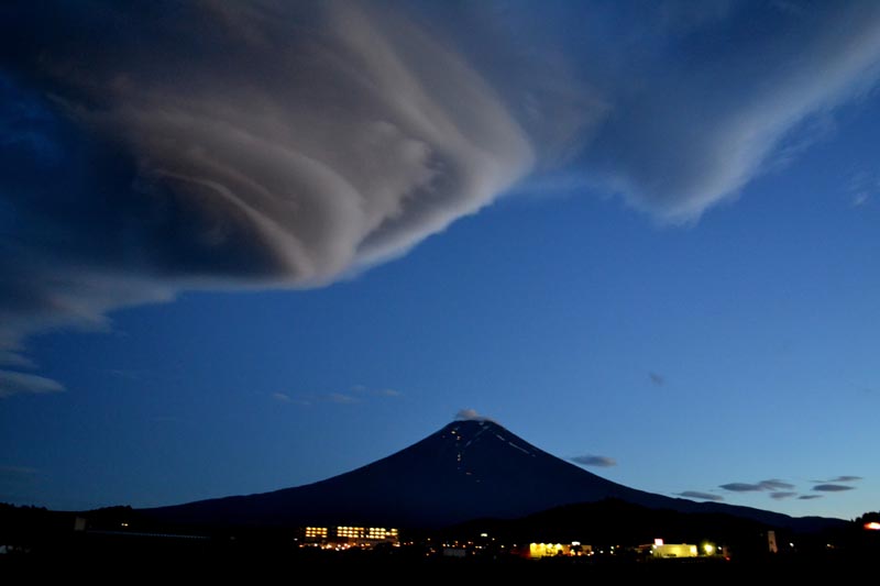 | 上の写真は2012年7月16日富士吉田市の農村公園から撮影したものです。 15、16日と長い時間つるし雲が観測できました。 あまりにも上空に大きく広がっているのでカメラに収まりきりませんでした。 夜に入り、家々の灯りがつき、富士山の山小屋の灯りが見えます。 |