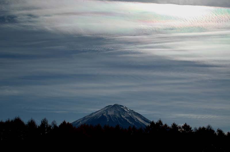 彩雲は薄い雲に上から太陽の光があたった時、虹のように輝く雲のことです。 太陽が真上にあり、雲が薄い時見ることができるので、昼前後に多くなります。 昼時は、富士山を見る機会が少ないせいか、彩雲の写真は多くありません。 |