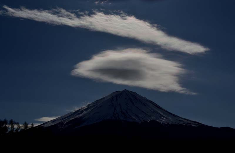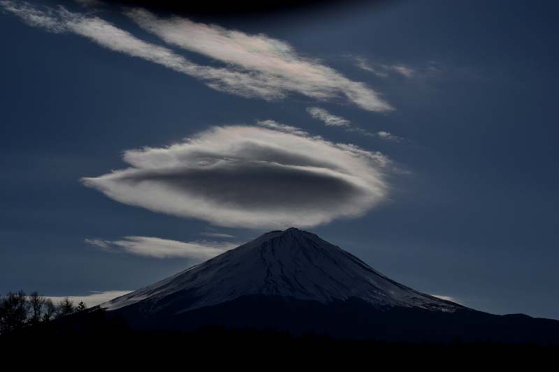 | 上の写真は2013年1月12日鳴沢から撮影したものです。 その上と同じもので、時間が少し違うだけです。 笠雲もその上の雲も短時間で激しく変化します。 ちょっと目を離すと消えてしまうことがあります。 彩雲を見たら、すぐ撮影しないと撮れません。 |