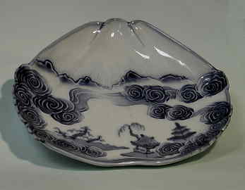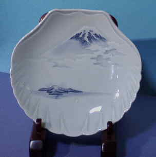 | 上左から青山の陶器店で販売していた富士山皿(2枚)、三島の陶器店で販売していた変わった形の器(2枚)三島のお店ではここの店主が特注で色々作成していた。まだここに掲載していないが佐賀の志多焼きに富士図を描いたものがある。 | ||||||||||||||||||||