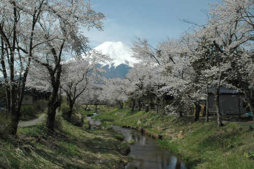 | 美しい忍野からの桜と富士(2007.4.21) | 新名庄川の足元に浮かぶ油(2007.4.21) | |||||||