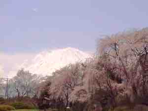 富士ビューホテル 富士ビューホテルにはホテル前に大きなしだれ桜があり、バックに富士山を見ることができます。また、裏庭にも多くのソメイヨシノがあり楽しむことができます。右下の写真は2000年4月25日頃です。年によって開花時期は異なります。開花状況を問い合わせてから行くのが良いでしょう。富士ビューホテルは富士河口湖町(役場TEL0555-72-1111)にあります。 |