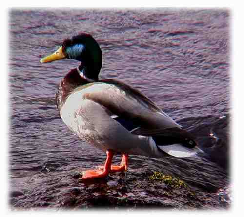 | マガモ:これは大明見の桂川で撮ったものです。冬の河口湖や山中湖ではいつでも見ることができます。桂川のような比較的流れが急で狭い場所にもいるものですね。橋の上からでしたのでアップで撮れました。 |