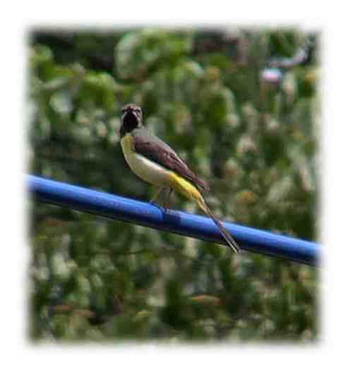 | キセキレイ:この写真は鳴沢の自宅前で撮ったものです。桂川周辺でも民家の軒先にいたり、山道でも自動車の前を道案内のようにして進む姿を目にします。愛犬ならぬ愛鳥と呼ぶ野鳥かも知れません。 |