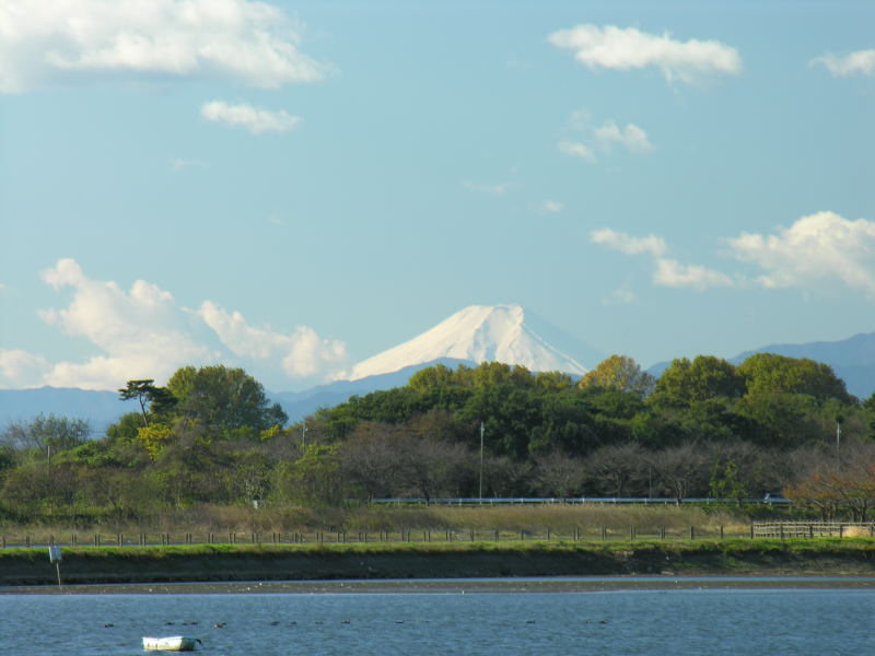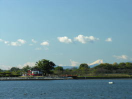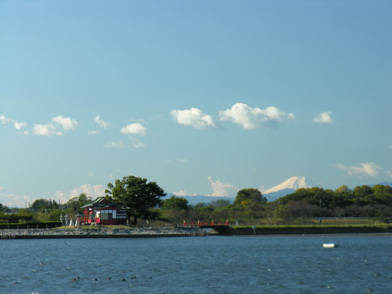 下は渡良瀬遊水地から西15Km程のところにある多々良沼からの富士山です。多々良沼は館林市にあり、白鳥(コハクチョウ/オオハクチョウ)の飛来地として知られたところです。写真左の赤い建物は沼の中央にある浮島弁才天 という神社で、池の中央に突き出た陸続きの島のような場所にあります。