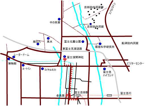 | 富士山の登山道は平成2005年の現在、山梨県側には吉田口登山道、河口湖からスバルライン、精進口登山道があり、5合目からは吉田口登山道に合流する。そのうちの1つ吉田口登山道は現在河口湖からのスバルラインに人が集中し、閑散としている。しかし、それだけにゆっくり散策するのには最適な散策ルートである。ここでは、富士吉田駅から北口本宮浅間神社を経て、中の茶屋、馬返し、五合目までを紹介したいと思っているが、とりあえずその第一として富士吉田駅から浅間神社までを紹介する。 | |||||