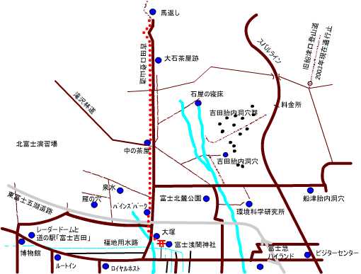 大塚 浅間神社の「富士北口登山本道」にある鳥居(登山門)を出ると赤松の林が続く。これを諏訪の森と呼ぶ。登山門から200m進んだ左側に小さな小山がある。遊園地にあるジャングルジムよりちょっと大き目の小山だ。これを「大塚」と呼び、頂上に小さな祠が祀られている。昔日本武尊がここから富士を遥拝した場所と伝えられている。大正時代頃の大塚周辺は現在のように松がなく、富士山を裾野まで眺めることができたが2003年現在は松林にさえぎられてここから富士山を見ることはできない。日本武尊がいた昔も松林など背の高い林が無く、富士山を遥拝できたのだろう。 大塚の道向かいに現在も「富士山自動車」の敷地を現す看板が立っている。大正時代から昭和中期、吉田口登山道の最盛期はここ(浅間神社裏)から馬返しまでバスが通っていた。富士吉田駅からここまでは送迎車がでていたと思う。昭和4年度の富士山北口合同組合の「登山の栞(しおり)」には浅間神社裏から馬返しまで1人1円20銭(下り1円)とでている。このとき大月−富士吉田間の電車賃は70銭だった。現在の吉田口登山道と平行してその道路が走っている。舗装していないので、雨で荒れ果てているが、当時の様子を少し残している。舗装道路は自動車が通り、登山道として危険なので、この旧自動車道を歩行者専用の登山道として整備することに期待の声が上がっている。左の地図は富士山自動車と船津口登山道の有料バス路線(5合目まで)を表示した昭和30年頃の観光案内地図の一部。 パインズパーク 大塚を過ぎると、左手に小さな路地があり、その奥に秀年窯がある。富士北麓の土を素材に焼物を作っている。その路地を突き抜け、舗装道路を横切り少し進んだ左側に石の彫刻や石材が目に付く。石の彫刻家浜田さんの工房だ。富士北麓には、このような芸術家が多くの工房をもち芸術作品を創作している。秀年窯の入り口を過ぎ吉田口登山道を富士山に向かう。約400mで左手に芝生の広大な公園、富士パインズパーク(諏訪ノ森自然公園)がある。昭和後期にできた公園で、芝生公園と赤松林の遊歩道がある。この公園からの富士山はお勧めの1つだ。富士山のビュースポットは2ヶ所あり、1ヶ所は芝生の手前から富士山を見る場所(下の写真)、もう1ヶ所は遊歩道の池手前から富士山を見る場所だ。ここからは逆さ富士を見ることができる。写真を撮るのには朝がお勧 パインズパークを出て富士山に向かうこと900mで登山道の上空を高速道路が横切っている。河口湖から北富士演習場を横に見て須走りへ抜ける東富士五湖道路だ。これを抜けて700m進むと左に小さな枝道が分岐している。泉水の入り口だ。(「泉瑞」と標識には記載されている。いろいろな漢字が使われている。)乗用車1台が通れる程度の道だが、大雨の後などは道路がえぐられ、普通の車では通れない時もある。常に整備はされているが通れないと思った場合は入らないほうが良い。入り口から700mで泉水だが、700m直前で左にさらに分岐している。表示はあるが、見落とすと先は演習場まで続いている。演習場への道は平日途中で通行止めになっている。泉水への分岐を見落とさず左に入るとすぐに鳥居や小さな祠が見える。道の先が窪地になっていて水道の蛇口が地上に伸び、途切れることはなくボトボトと水が出ている。泉水の水源だ。土日だけでなく平日でも誰かが水を汲みに来ている。湧水マニアには有名なスポットなのだ。 泉水は「源頼朝公の矢水」と呼ばれ、大昔から湧水として活用されていたようだ。明治、大正時代頃だろうか、ここには小さな池があり、泉水池と呼ばれていた。そのことからすると、やはり水源としては細くなっているようである。最近では忍野八海も湧水量が少なくなっていると心配されるように、富士山周辺の湧水量は全体として減少傾向にある。雨量は特に少なくなっているようではないので、湧水以外の水との配分が変化したことによるのだろう。 富士登山する場合はここに立ち寄る必要はないが、北麓を散策する場合は、ここに立ち寄り、さらに南に入ったところにある「雁の穴」や、北富士演習場を散策するルートもお勧めだ。 |