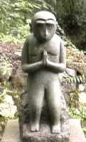 馬返しの鳥居の左右に猿の石造がある。富士山には猿がいないと言われているので、な ぜ猿なのか良く分からないが、浅間神社では申(さる)の日が祭日となっている、また、「山岳を身体とする神様の”お使い”としてふさわしい」(岩科著「富士講の歴史」)ので猿を山人として山門に配しているのではないかと言われている。上の登山道を見上げると木の茂みに入るような感触をもつ。ここまでは山道と言うより丘を登る感じで緩やかだった。それだけに馬返しから突然急な上りになる。昔はここまで草原だったようだ。現在は高い木々が視界をさえぎっている。それでも鳥居の近くから後を振り返ると林越しに三つ峠が見える。いよいよ富士登山開始だと感じる。馬返しから800m程度で鈴原神社に着く。1合目だ。この間はかなり急で直線的な上りになっている。その上斜面を掘り下げて道路を作ったようで、道の両側は掘ったままの細かい砂礫の斜面が露出しているので、雨が降ると砂礫はぼろぼろと路面に落ちてくる。また、もともとそのような地質なので雨が降ると路面がえぐられて歩くのも大変な悪路になる。要所に浸透枡が作られ雨水の対策が施されているが、路肩の斜面はそのままなので時間がたつと砂礫が流れて埋まってしまいそうである。