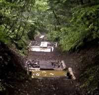 りゅうガ馬場(りゅうがばば)と呼ばれ近くで流鏑馬(やぶさめ)を行っていたようだがどのあたりか、平成15年の今は藪の中である。この流鏑馬は勝山の浅間神社で復活し現在行われてい る。平成15年8月現在、進行方向左に柵ができている。車止めだ。中央に踏み石の参道ができて鳥居に導いてくれる。鳥居の左側に多くの石碑が祭られている。富士講の石碑だ。ひときわ高い角柱の石碑(写真右)が鳥居の向こうに立っている。禊所(みそぎどころ)跡の記念碑だ。昭和40年代にはこの石柱に並んで建物が残っていた。過去の茶屋跡などは取り払われ登山道整備に伴ってこれらの石碑群は寄せ集められているので昔の面影は碑面に残っているだけだ。以前の状況は富士吉田市文化財調査報告書第3集に詳しい解説がある。鳥居右側に黒い塀の建物がある。明治大学山荘と看板がある。禊所記念碑の左手から登山道が登りになる。これと平行して旧登山道があるが入り口は分かりづらい。禊所記念碑の左手前奥にわずかに獣道程度の道が上に上っている。旧道だと思う。残念ながらほとんど未整備 なので現状では通らない方が良い。現在旧道を整備して散策道とする期待の声が上がっているので、旧道も整備される可能性がある。その時には自然との調和を保った整備が期待される。新道は砂礫の路面を直線に掘り下げて上の鈴原神社まで通じている。直線で砂礫を掘ったままの道路は一雨でえぐられ通行できなくなる。そのためか、ところどころ浸透枡を作って整備されている。(写真左)