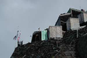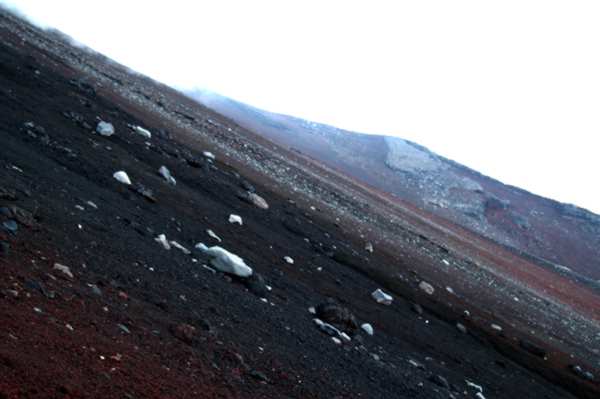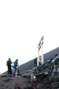 入道雲を見下ろすような八合目から頂上 私は、この後、大日岳を登り17時半、五合目に向かい一人下山しました。登山中大勢いた人は殆ど山小屋に宿泊です。下山は1人下山でした。最初の下山口を間違え、登山口を下ったので岩山を下る時は、登りより大変でした。途中で下山道に入り、須走り口との分岐を注意し吉田口下山道を下る途中で周囲は暗くなり、7合目では真っ暗になってしまいました。ほとんど使わないと思っていたサーチライトが役に立ちました。どこが道なのか分からないので、左を照らし、右を照らして恐る恐る確認しながらの下山は心細いものがありました。6合目の登山道合流点まで降りると様子は一変しました。東京のラッシュアワーの電車から降りてくる集団のように大勢の登山客がわいわいとそれぞれサーチライトをつけて登ってきました。そうか、みんな、こんな時間に登って、途中に宿泊し、御来光を楽しむんだなーと実感させられました。それにしても大勢です。これでは山小屋も満杯になるだろうと思える人の数でした。今度は登山者のサーチライトの逆光に悩まされながら五合目に下り、迎えの車に乗ったのは21時でした。下りは休まず3時間半でした。 やはり富士山は途中で宿泊した方が良いと強く実感したのは、翌日でした。身体はだるく、一日なにも手付かずでした。そのうち、日焼けした部分が黒ずんでボツボツが出始めました。お風呂に入ると、そこがヒリヒリ痛く、一週間ぐらい大変な思いをしてお風呂に入りました。後で気づいたことですが、マスクが必需品です。私は1人下山だったので、必要がありませんでしたが、あの集団が下山する時は、自分たちが巻き上げる砂埃が後ろの人に襲い掛かります。大勢の登山者がサングラスにマフラーをして殆ど肌を隠した格好で下山していましたが、登山の服装や装備の必要性を下山してあらためて認識させられました。 この他の反省点と主な持ち物 帽子:あご紐付きを持っていくこと:今回3回飛ばされた。帽子止めというものもあるようです。 靴:登山靴だったが下山道でスパッツが欲しかった。何回も砂を掻き出した。 ザック:今回は小さいザックとカメラを手提げ袋に持っていった。手提げは途中でザックに詰め込んだが、最初から大きなザックにまとめて手には金剛杖だけにすればよかった。 雨具:五合目で風が冷たく準備していった雨具が丁度良い登山着となった。山頂では、それでも寒く、防寒用に雨具の下に着る長袖が欲しかった。特に、山頂の風はものすごく寒く、手や顔が痛くなった。 携帯電話:持っていったが山頂では圏外でした。六合目から八合目で何とか通じOK。五合目は圏外の場所有。(ちなみに持っていったのはauです。2005年当時) 水:500ccを二本、一本は酢を少し入れた。山小屋で1本購入。飲みきったものはつぶして持ち帰るようにペットボトルが楽です。七合目でリポビタンD購入。400円。その場で飲んで空き瓶は引き取ってくれるのでGood。 携帯酸素:一本持っていった。八合目から少しずつ吸引したが、効果の程は不明。最後まで容器が邪魔な存在だった。 ヘッドランプ:持っていったのは相当強力なもの。助かった。使ったのは2時間程度だったので、予備の電池は使わないで持ち帰った。 おにぎり:梅とおかかのおにぎりを4個。1個残したのは、うどんを食べたため。 飴:殆ど食べなかった。 梅干:種無しをコンビニで買って1袋持っていった。役立った。全部食べた。 チョコレート:小さく分かれたのを持っていった。少しだけ使った。 金剛杖:五合目で購入。旗付き1500円。旗はいらなかった。(旗なし1000円、途中の山小屋でも買えるが旗なしで1500円でした)岩場が多いので、木の金剛杖は非常に使いやすかった。焼印もできるので、ストックを準備するよりお勧め。 手袋:軍手を持っていったが、カメラを使うので、殆ど使わなかった。 手ぬぐい:必需品。 下着の予備:今回は持っていったが使わなかった。 傷バン:今回忘れたが、用意した方が良い。山頂の大日岳の岩は触れば切れそうな程ゴツゴツだった。 保険証:今回持っていかなかった。写しを入れておく方が良い。 自分の連絡先のメモ:名刺に連絡先を記入して持っていった。 ウェットティッシュ:水に塗らしたなっぷきんでも良い。食事の後の手の汚れなど役に立つ。持っていないと、手を貴重な水で洗うことになる。 トイレットペーパー:今回は水溶性ティッシュを持っていったが、トイレットペーパーをたたんで持っていくと良い。 お金:山小屋に急に泊まるにも先立つものはお金。一泊食事つきで8500円(知人が8合目に予約した時の値段。山小屋によって異なるようです。)。水500ml500円など食料飲料などは山小屋で入手できるので余裕を持って用意必要。 (完:以上の記録は2005年登頂時の記録を基にしていますので、現在は変わっている場合がありますので、ご了承下さい。) |