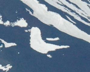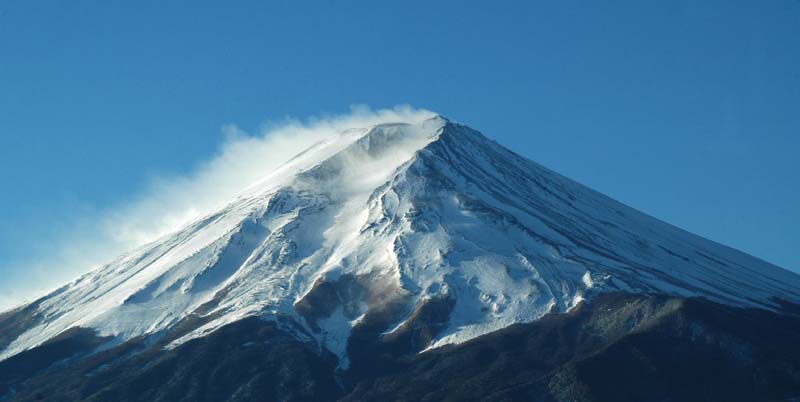 | 姿を見せぬ農鳥 真冬、真っ白な雪が山頂を覆う。偏西風で飛ばされた雪が雲になる。この頃は農鳥もほとんど姿を現さない。 鳳凰(その1) 真冬、偏西風で雪が飛ばされると、うっすらと地肌が現れる。このようなときに大きな鳥「鳳凰」が姿を現す。 |