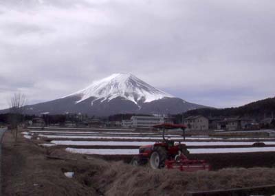 | スマートな農鳥 農鳥は鳳凰から卵まで雪形七変化。実にみごとな雪形であるが、変化の途中にはスマートな農鳥(上写真)にも変化している。一般的に農鳥と呼ばれる姿からは想像もできない超高速で飛んでいる農鳥である。実は鳳凰の羽が消えた後に現れるので、良く見ると鳳凰の見事な羽がかすかに見えているのが分かる。この雪形は残雪が偏西風に飛ばされて、北側斜面の雪が殆どない状態になったとき見える。このように富士山の雪形は、気温が温かくなって雪が融けた残雪による雪形と強い偏西風によって斜面の雪が吹き飛ばされてできる雪形の両方がある。 積雪の時期や風力、気温、斜面の場所など色々な要素が絡み合ってできる雪形。まだ未知の雪形があるかも知れない。田んぼが雪で覆われている頃「スマートな農鳥」が現れる |