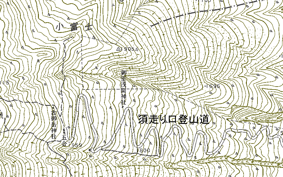 須走り口の昔、中食堂と呼ばれた場所が近いですね。最近(2002年)の小富士と須走り登山道の地図です。(平成14年6月発行国土地理院25000分の1甲府CD−ROMより)(正解 須走口)