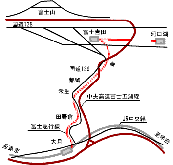 終点の河口湖駅まで富士山は良く見える。 富士急行線は大月から河口湖に向かうのが「下り」、しかし大月を出発してから電車は常に坂を富士山に向かって「上り」続ける。もちろん河口湖から大月に向かう「上り」列車でも最後尾に陣取れば富士山は良く見える。 電車が込んでいると右に行ったり左に行ったりできないが、秋から冬にかけて乗客の少ない時間帯は富士山をじっくり見ながら自分専用の列車のように振舞うことができる。平日の通勤通学の時間帯は混むので避けたい。富士山をきれいに見るのには早朝の電車が最適だ。