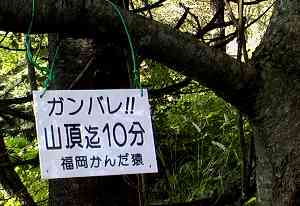 杓子山は高校生の頃に登って以来だった。 登山家からすると大した山ではないかもしれないが、頂上までの急坂は大変だった。 下の看板が大変な励みになった。 |