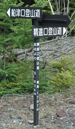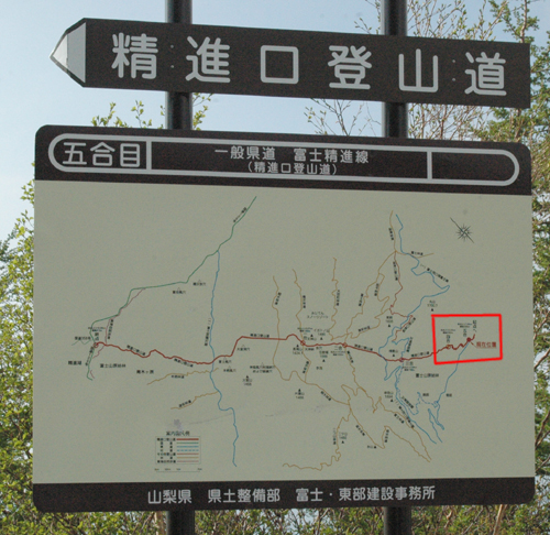 精進口登山道の標識に注意 精進口登山道には左のような親切な標識が設置されている。 しかし、ちょっと注意が必要だ。それは「起点より〇〇Km」の表示だ。上左の2合目の表示は「起点より8.02Km」、上右3合目の表示は「起点より5.62Km」そして下中の5合目では「起点より1.65Km」と赤池の出発点から登るとだんだん短くなっているのだ。 起点は吉田口登山道との交差点付近だろうか未確認である。 ちなみに、精進口登山道入り口の赤池の表示には「終点」と表示されている。 左下のように要所には全体図も出ているので、踏破して詳しく見ると、起点が5合目付近だと理解できるが、登山道としては下から〇〇Kmとか、五合目まであと〇〇Kmの表示の方が分かりやすい。私は最初途中の林道から入ったので、起点を赤池と考えてしまっていた。 |