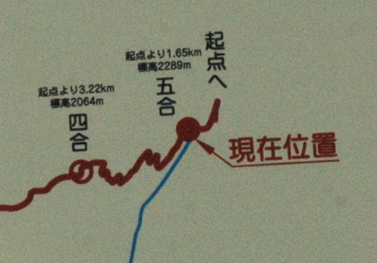 | 精進口登山道五合目駐車場の表示、左の赤枠を拡大したのが上中央の写真 「起点より1.65Km」実際の起点は、写真右のお中道を進んで吉田口登山道との交差付近だろうか。写真撮影は6月のため通行止めで起点を確認できなかった。 |