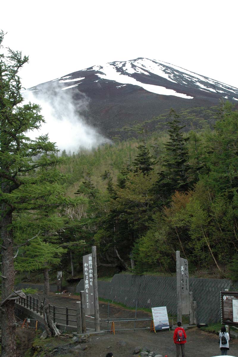 四合目にはつぶれた建物が無残な姿で残っている。(標高2053m)ここから五合目駐車場(標高2289m)までは九十九折の登山道になる。途中一ヶ所雪代(ゆきしろ)による道路崩壊ヶ所があり、ちょっとした迂回がある。夜間登山する場合注意が必要だ。 五合目に近くなると、シラカバが目立ち、ハクサンシャクナゲ、コケモモが現れる。7月中旬シャクナゲの花は満開で足元には白い可憐なコケモモの花がじゅうたんのように咲きほこっていた。梅雨明けの五合目は、この他にもベニバナイチヤクソウなど可憐な花が楽しめる。五合目から上は高木がなく、火山砂礫に這いつくばるようにオンタデ、フジイタドリなどが咲く。 頭上を見上げるとすぐ手の届きそうな場所に山頂らしき三角形の頂点が迫っている。オンタデなどの黄色や緑は山頂に向かってグラデーションのように薄くなり、山頂は赤茶けた砂礫の色一色となる。 五合目駐車場は人、人、人の波で登山道の静寂がうそのようだ。 |